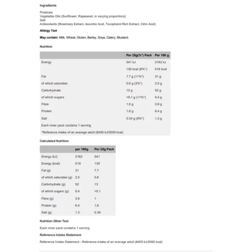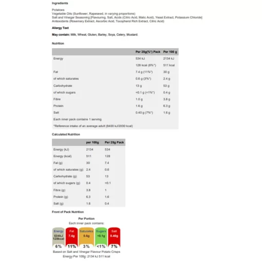 Ingredients:Ready Salted: Salt, Antioxidants (Rosemary Extract, Ascorbic Acid, Tocopherol Rich Extract, Citric Acid) Cheese & Onion: Salt, Cheese Powder (from Milk), Onion Powder, Flavouring, Acidity Regulators (Citric Acid, Malic Acid), Yeast Extract, Colour (Paprika Extract) Salt & Vinegar: Salt and Vinegar Seasoning [Flavouring, Salt, Acids (Citric Acid, Malic Acid), Yeast Extract, Potassium Chloride], Antioxidants (Rosemary Extract, Ascorbic Acid, Tocopherol Rich Extract, Citric Acid) Prawn Cocktail: Salt, Flavouring [Sugar, Flavourings (contain Milk, Wheat, Celery), Dried Tomato, Dried Onion, Spices, Acid (Citric Acid)], Prawn Flavour (Crustacean), Colour (Paprika Extract)