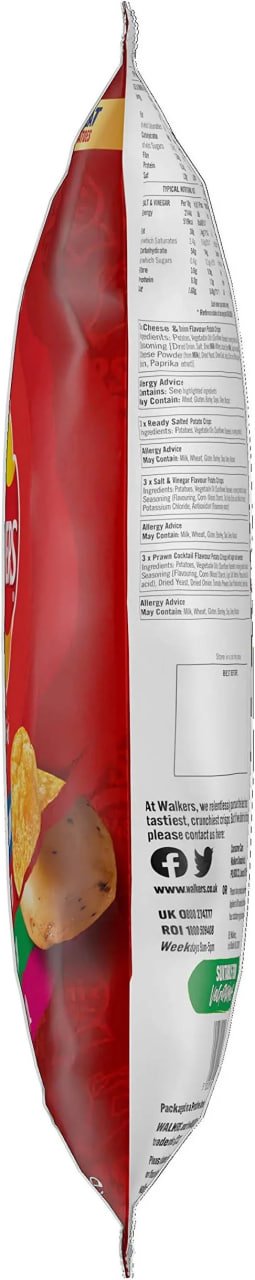 3 x Cheese & Onion Flavour Potato Crisps: Potatoes, Vegetable Oils (Sunflower, Rapeseed, in varying proportions), Cheese & Onion Seasoning [Dried Onion, Salt, Dried MILK Whey, Lactose (from MILK), Sugar, Flavouring (contains MILK), Cheese Powder (from MILK), Dried Yeast, Dried Garlic, Acids (Citric Acid, Malic Acid), Colours (Annatto Bixin, Paprika Extract)] 3 X Ready Salted Flavour Potato Crisps: Potatoes, Vegetable Oils (Sunflower, Rapeseed, in varying proportions), Salt. 3 x Salt & Vinegar Flavour Potato Crisps: Potatoes, Vegetable Oil (Sunflower, Rapeseed, in varying proportions), Salt and Vinegar Seasoning [Flavouring, Salt, Acids (Citric Acid, Malic Acid), Yeast Extract, Potassium Chloride, Antioxidant (Rosemary Extract)] 3 x Prawn Cocktail Flavour Potato Crisps: Potatoes, Vegetable Oils (Sunflower, Rapeseed, in varying proportions), Prawn Cocktail Seasoning [Flavouring, Sugar, Salt, Dextrose, Potassium Chloride, Acid (Citric Acid), Dried Yeast, Dried Onion, Tomato Powder, Colour (Paprika Extract), Sweetener (Sucralose)]